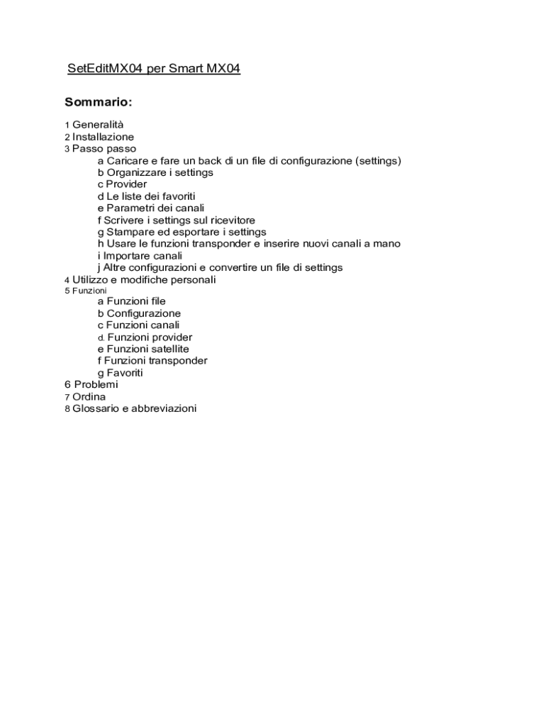 SetEditMX04 per Smart MX04 Sommario: 1 Generalit 2 Installazione 3 Passo passoa Caricare e fare un back di un file di configurazione (settings) b Organizzare i settings c Provider d Le liste dei favoriti