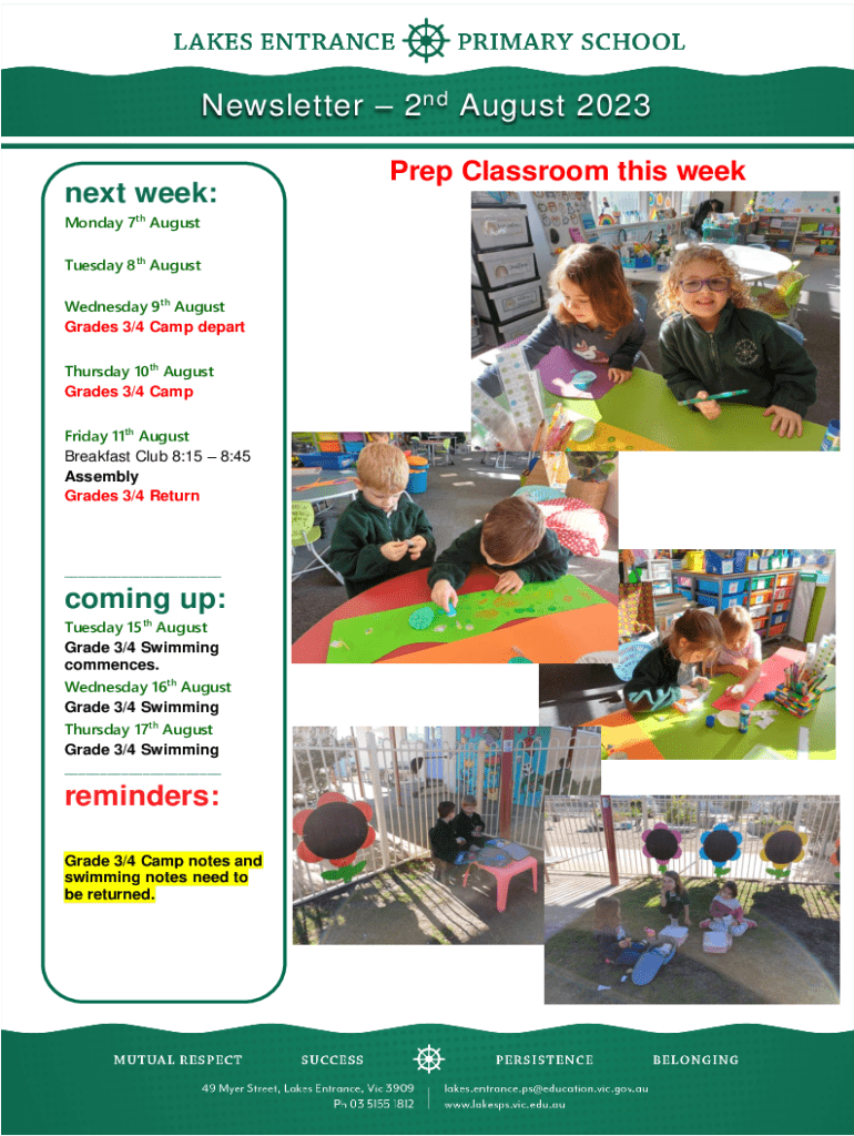 Newsletter 2 nd August 2023 next week: Monday 7th August Tuesday 8th August Wednesday 9th August Grades 3/4 Camp depart Thursday 10th August Grades 3/4 Camp Friday 11th August Breakfast Club 8:15