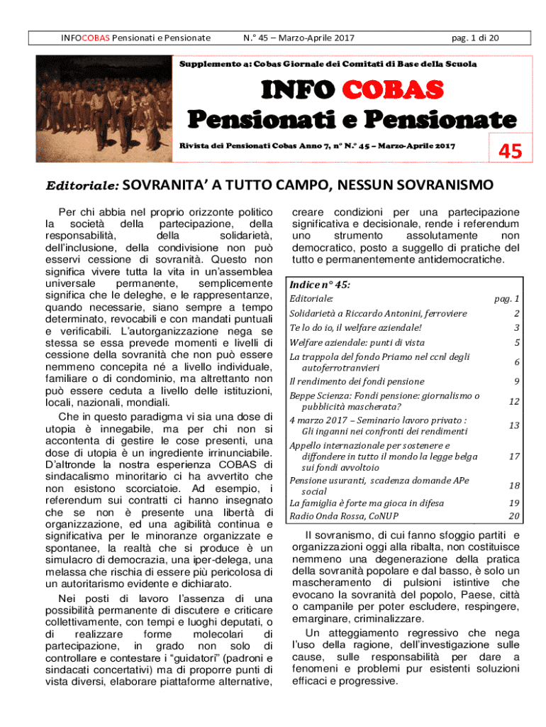INFOCOBAS Pensionati e PensionateN. 45 MarzoAprile 2017pag. 1 di 20Supplemento a: Cobas Giornale dei Comitati di Base della ScuolaINFO COBAS Pensionati e Pensionate Rivista dei Pensionati Cobas Anno