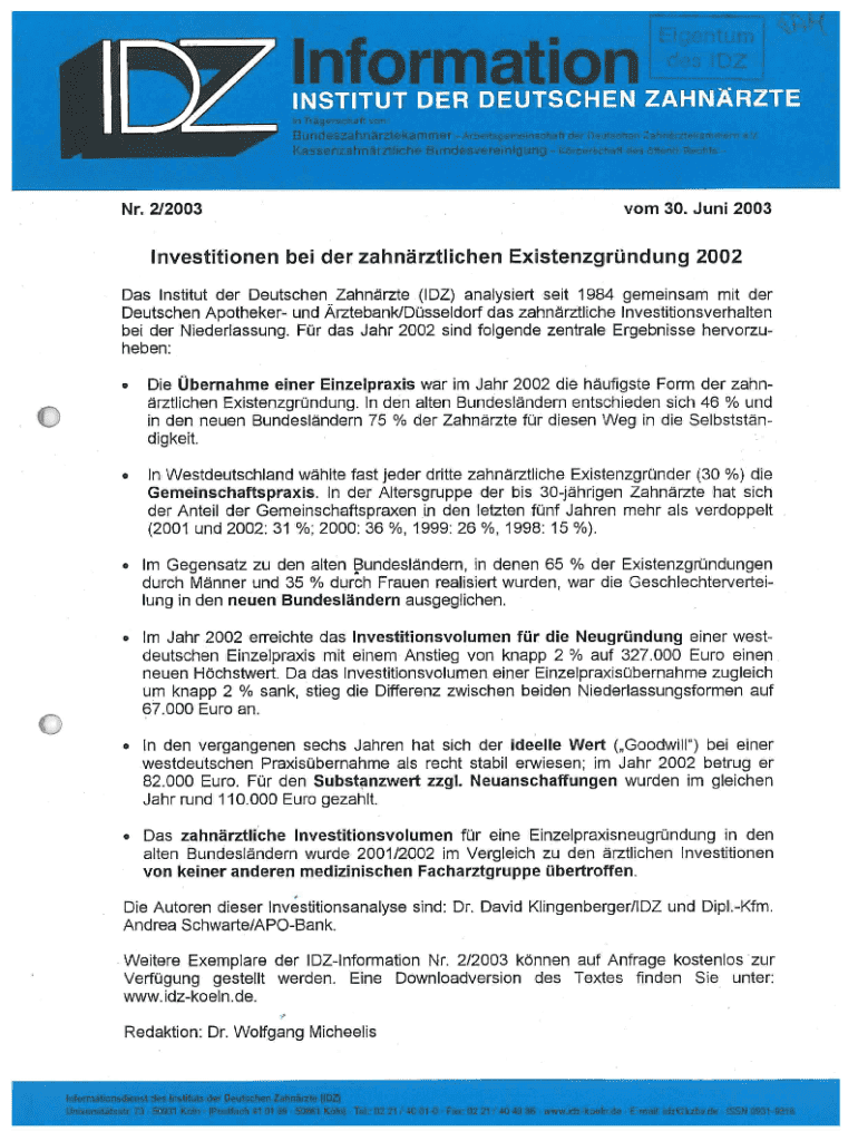 D7 1N ZAHNRZTE RIDZUTSCSHEI I T DEI INS IITITUvom 30. Juni 2003Nr. 2/2003Investitionen bei der zahnrztlichen Existenzgrndung 2002 Das Institut der Deutschen Zahnrzte (IDZ) analysiert seit 1984 gemeinsam