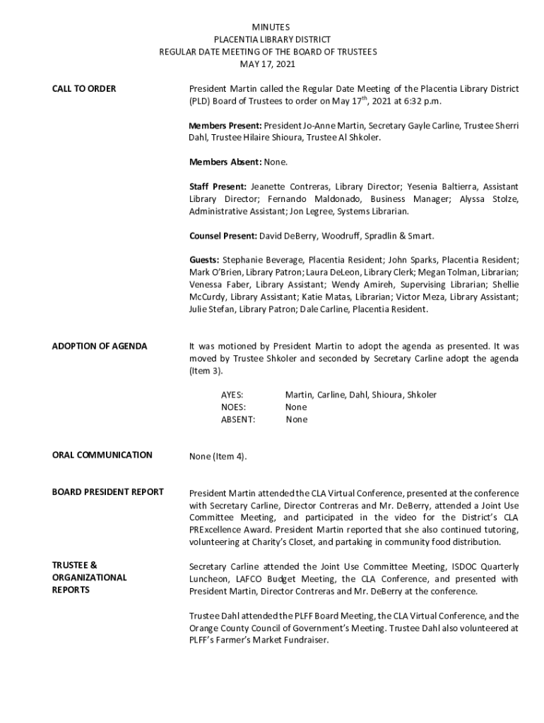 MINUTES PLACENTIA LIBRARY DISTRICT REGULAR DATE MEETING OF THE BOARD OF TRUSTEES MAY 17, 2021 CALL TO ORDERPresident Martin called the Regular Date Meeting of the Placentia Library District (PLD)