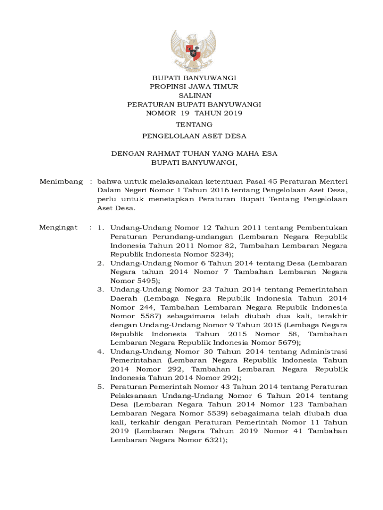 BUPATI BANYUWANGI PROPINSI JAWA TIMUR SALINAN PERATURAN BUPATI BANYUWANGI NOMOR 19 TAHUN 2019 TENTANG PENGELOLAAN ASET DESA DENGAN RAHMAT TUHAN YANG MAHA ESA BUPATI BANYUWANGI, Menimbang : bahwa untuk