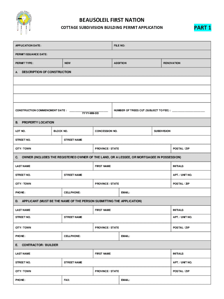 BEAUSOLEIL FIRST NATION PART 1COTTAGE SUBDIVISION BUILDING PERMIT APPLICATIONAPPLICATION DATE:FILE NO:PERMIT ISSUANCE DATE: PERMIT TYPE: A.NEW___ YYYYMMDDBLOCK NO.STREET NO.SUBDIVISIONPROVINCE / STATEPOSTAL