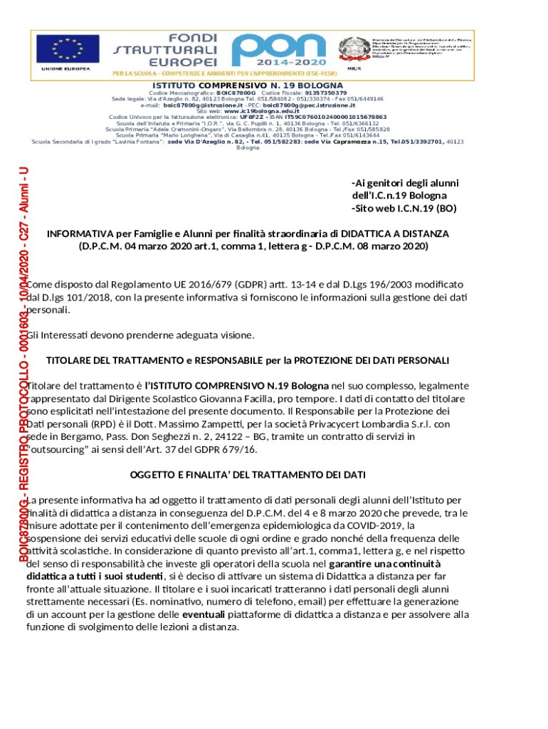 ISTITUTO COMPRENSIVO N. 19 BOLOGNABOIC87800G REGISTRO PROTOCOLLO 0001603 10/04/2020 C27 Alunni UCodice Meccanografcoo BOIC87800G Codice Fiscaleo 91357350379 Sede legaleo Via d\'Azeglio n. 82, 40123