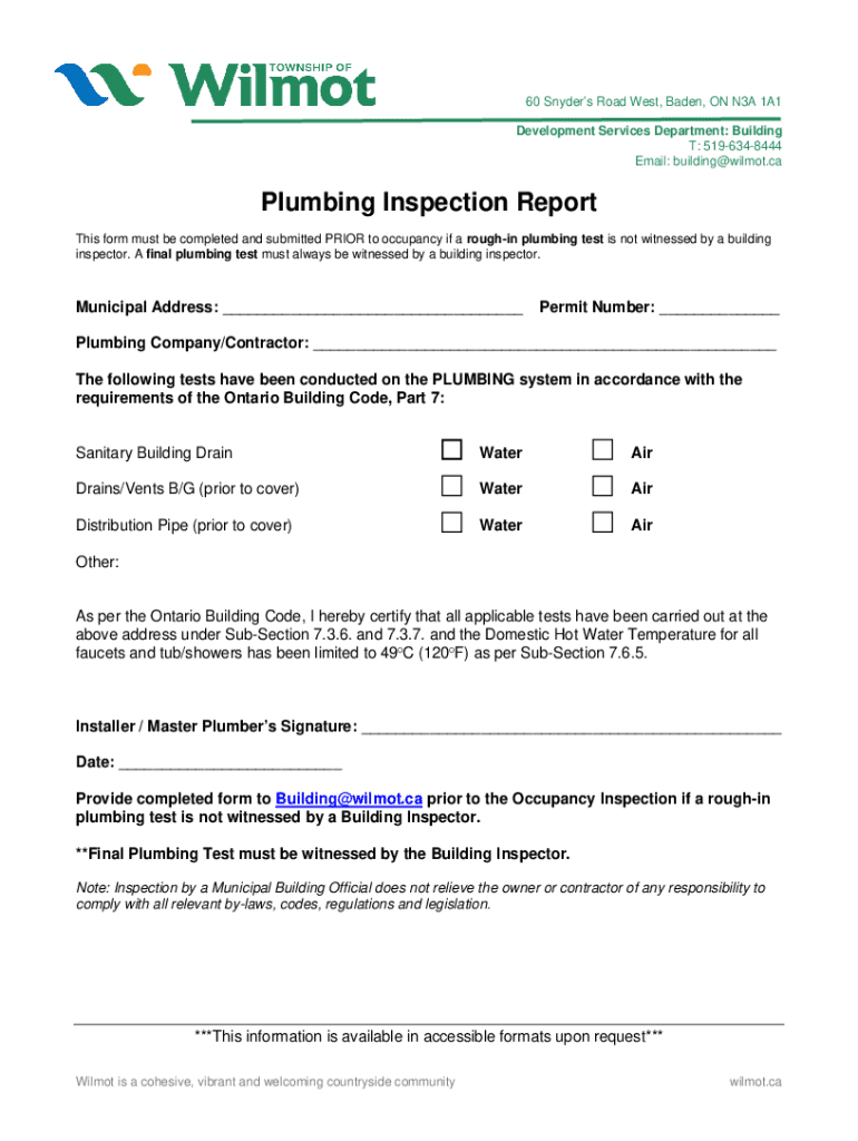 60 Snyders Road West, Baden, ON N3A 1A1 Development Services Department: Building T: 5196348444 Email: building@wilmot.caPlumbing Inspection Report This form must be completed and submitted PRIOR