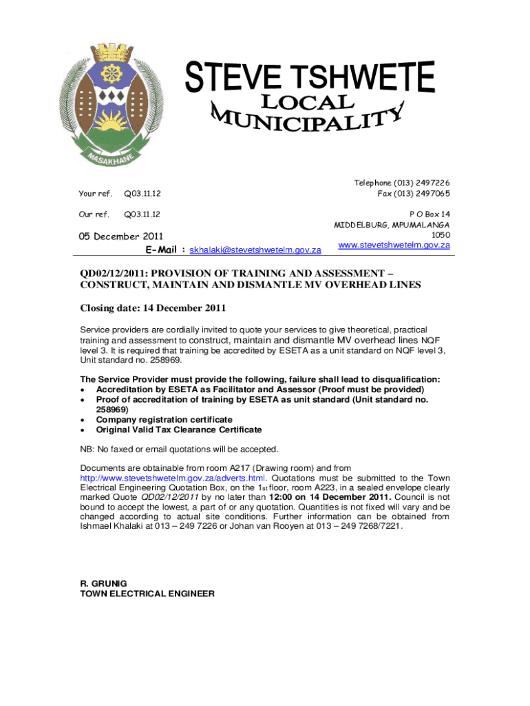 This document outlines the requirements for service providers to quote for training and assessment services related to the construction, maintenance, and dismantling of MV overhead lines at NQF level 3. It specifies the necessary accreditation, documentation, deliverables, and payment terms for successful completion of the training program.