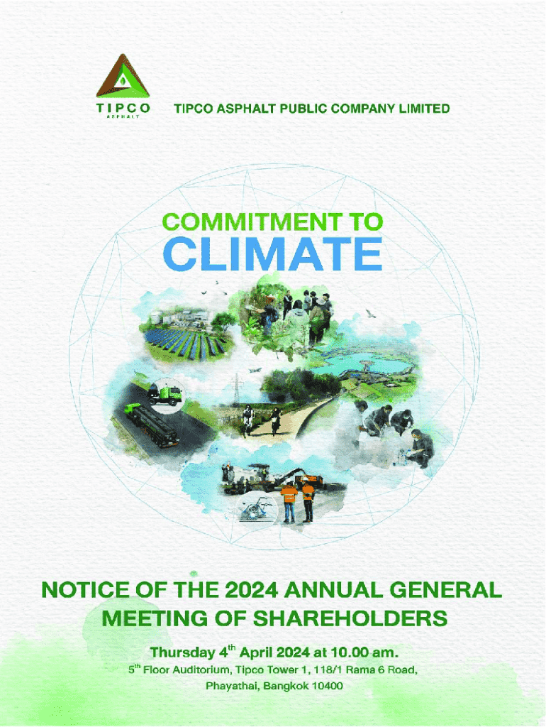 This document serves as a formal notice to shareholders of Tipco Asphalt Public Company Limited regarding the upcoming 2024 Annual General Meeting (AGM) scheduled for April 4, 2024. It outlines the meeting\'s agenda, including the adoption of previous meeting minutes, acknowledgment of company performance, approval of financial statements, investment plans, dividend payments, auditor appointments, and director nominations. Enclosures include relevant documents for shareholders\' review.