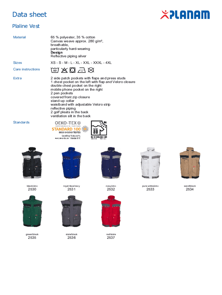 A comprehensive data sheet for the Plaline Vest, detailing its material composition, design features, size variations, care instructions, and available color standards.