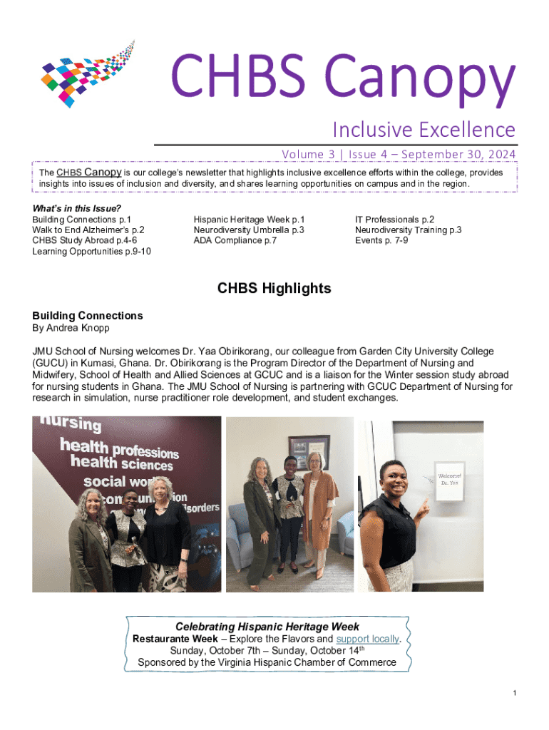 CHBS Canopy Inclusive Excellence Volume 3 | Issue 4 September 30, 2024 The CHBS Canopy is our colleges newsletter that highlights inclusive excellence efforts within the college, provides insights