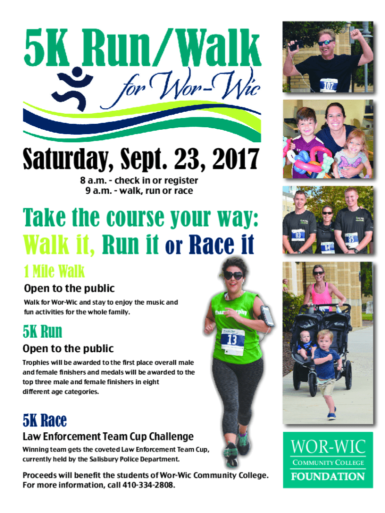 Saturday, Sept. 23, 2017 8 a.m. check in or register 9 a.m. walk, run or raceTake the course your way:Walk it, Run it or Race it 1 Mile WalkOpen to the publicWalk for WorWic and stay to enjoy the