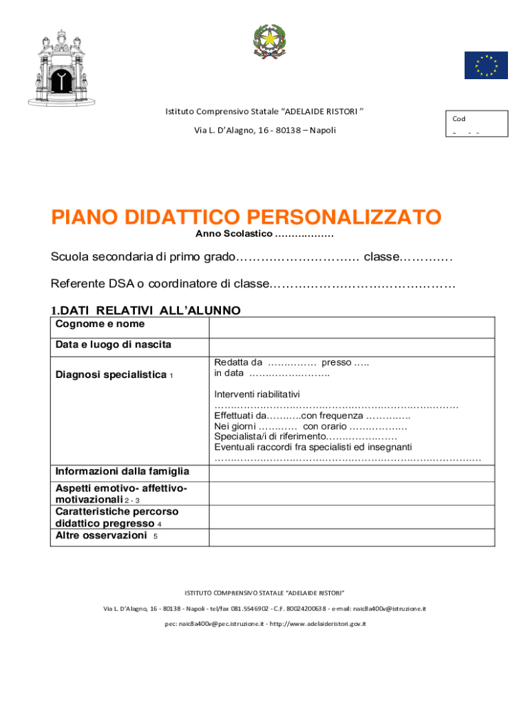 Istituto Comprensivo Statale ADELAIDE RISTORI Via L. DAlagno, 16 80138 NapoliCod Pag. 1 diPIANO DIDATTICO PERSONALIZZATO Anno Scolastico Scuola secondaria di primo grado classe. Referente DSA o coordinatore