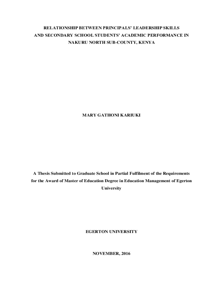 RELATIONSHIP BETWEEN PRINCIPALS LEADERSHIP SKILLS AND SECONDARY SCHOOL STUDENTS ACADEMIC PERFORMANCE IN NAKURU NORTH SUBCOUNTY, KENYAMARY GATHONI KARIUKIA Thesis Submitted to Graduate School in Partial