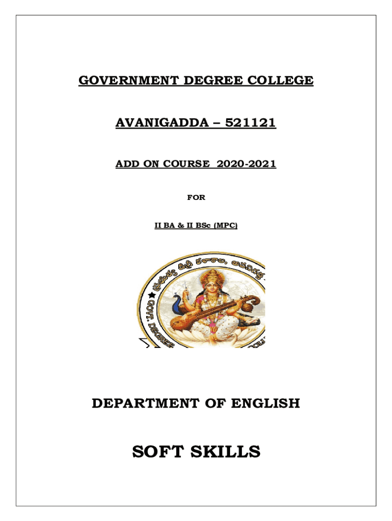 This document provides an overview of the Add On Course in Soft Skills offered by the Department of English at Government Degree College, Avanigadda. It outlines the course details, including the syllabus, enrolled students, performance assessment, and feedback received from participants. The course aims to equip students with essential soft skills necessary for personal and professional success in a globalized world.