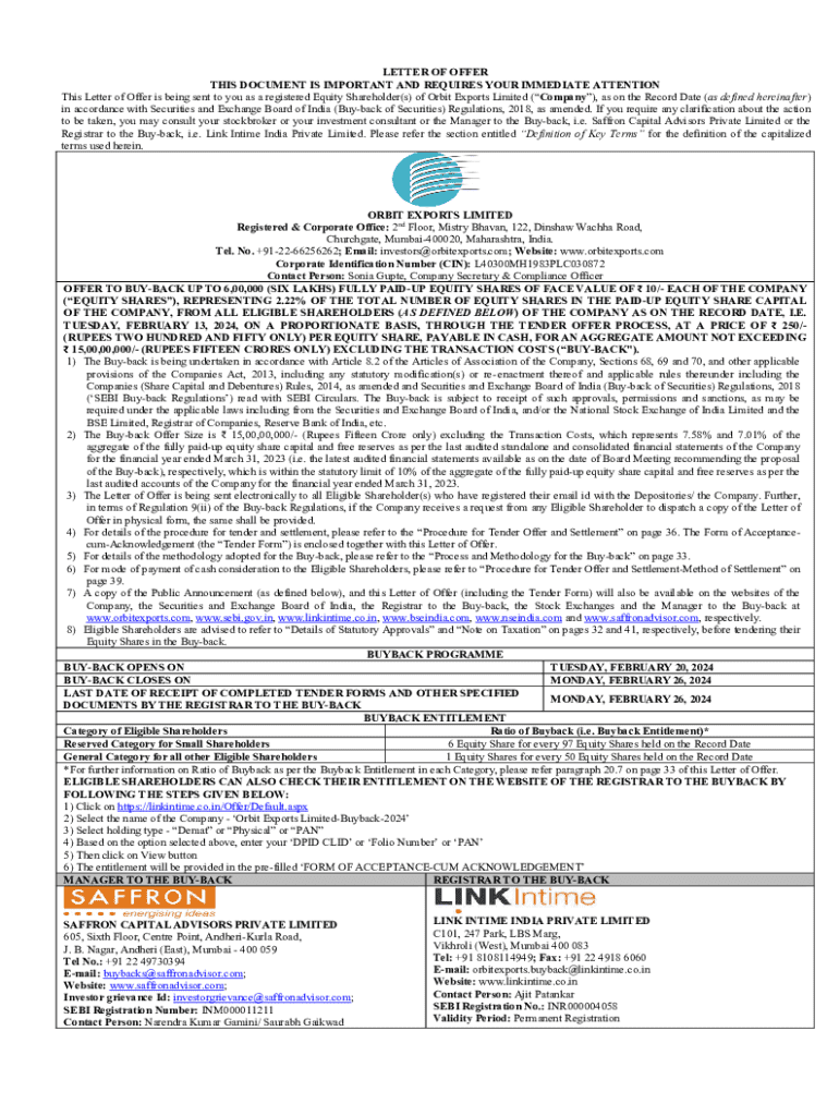 LETTER OF OFFER THIS DOCUMENT IS IMPORTANT AND REQUIRES YOUR IMMEDIATE ATTENTION This Letter of Offer is being sent to you as a registered Equity Shareholder(s) of Orbit Exports Limited (Company),