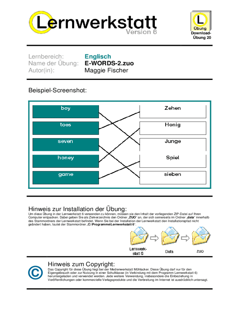 Downloadbung 20Lernbereich: Englisch Name der bung: EWORDS2.zuo Autor(in): Maggie Fischer BeispielScreenshot:Hinweis zur Installation der bung: Um diese bung in der Lernwerkstatt 6 verwenden zu knnen,