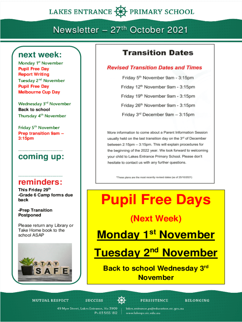 Newsletter 27 th October 2021 next week: Monday 1st November Pupil Free Day Report Writing Tuesday 2nd November Pupil Free Day Melbourne Cup Day Wednesday 3rd November Back to school Thursday 4th