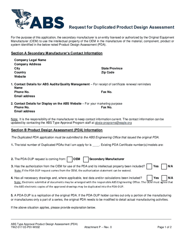 Request for Duplicated Product Design Assessment For the purpose of this application, the secondary manufacturer is an entity licensed or authorized by the Original Equipment Manufacturer (OEM) to
