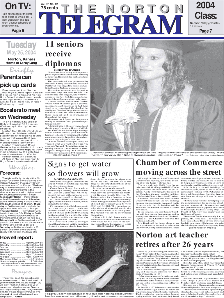 The Norton Telegram provides local news including graduation ceremonies, weather forecasts, community events, and updates on various organizations and schools in Norton, Kansas.