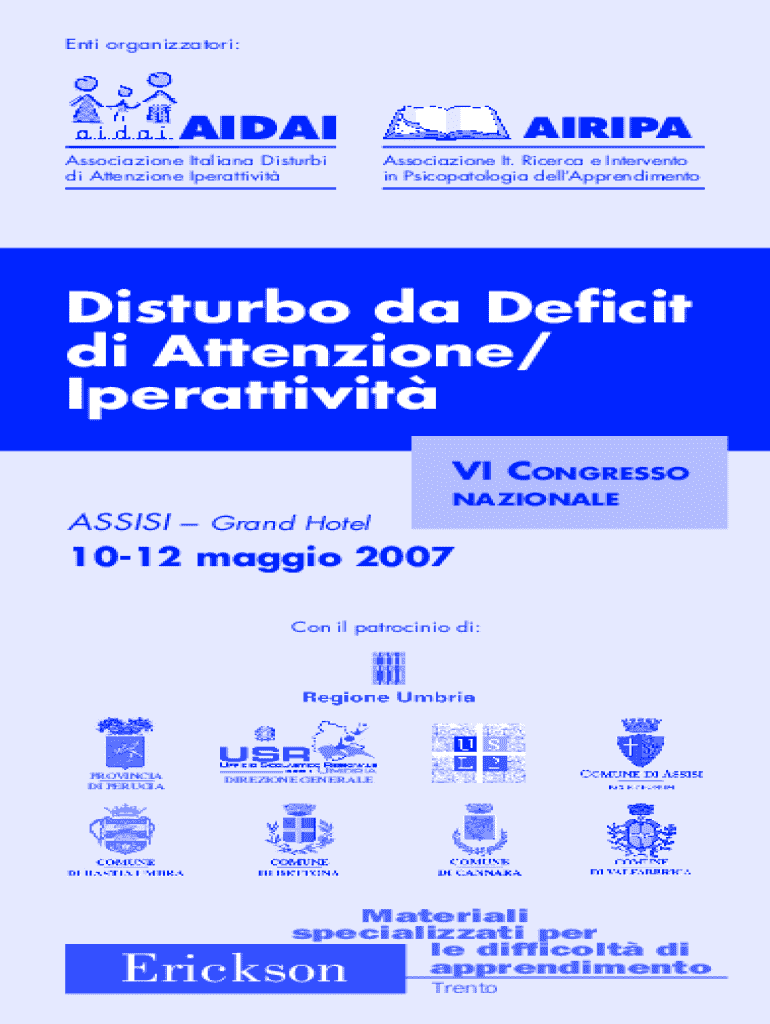 Enti organizzatori:AIDAI Associazione Italiana Disturbi di Attenzione IperattivitAIRIPA Associazione It. Ricerca e Intervento in Psicopatologia dellApprendimentoDisturbo da Decit di Attenzione/ Iperattivit
