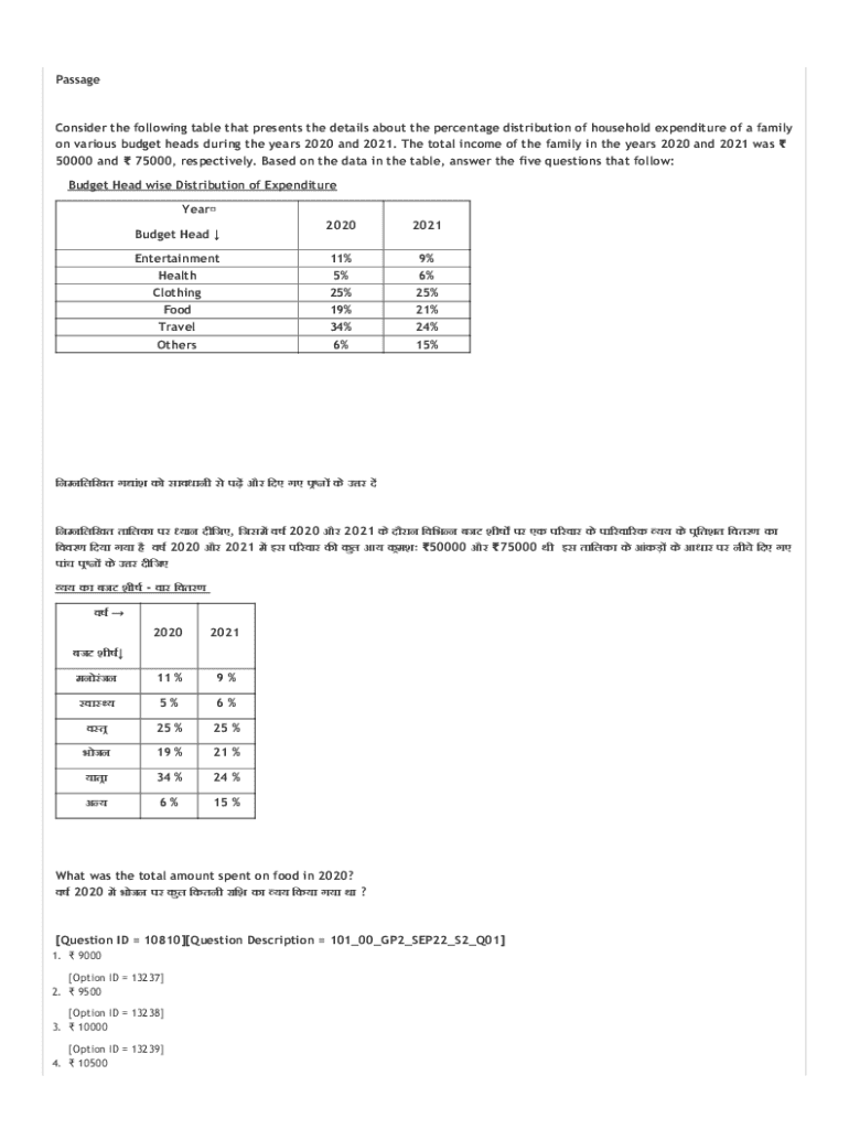 PassageConsider the following table that presents the details about the percentage distribution of household expenditure of a family on various budget heads during the years 2020 and 2021. The total