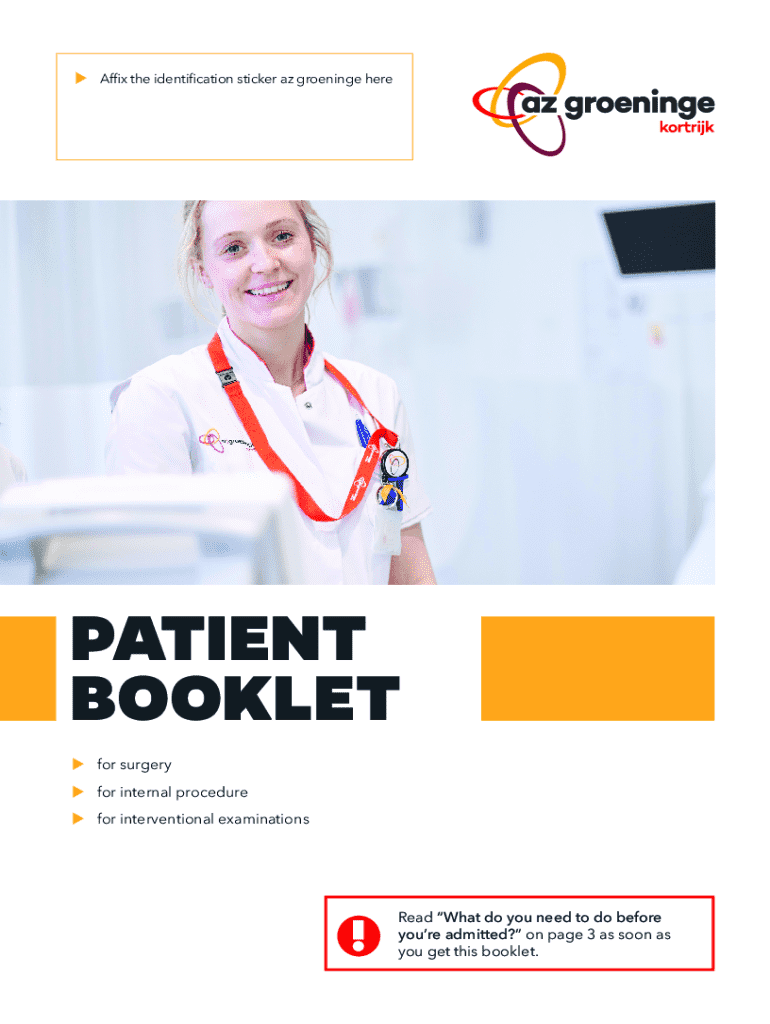 X Affix the identification sticker az groeninge herePATIENT BOOKLET X for surgery X for internal procedure X for interventional examinations!Read What do you need to do before youre admitted? on page