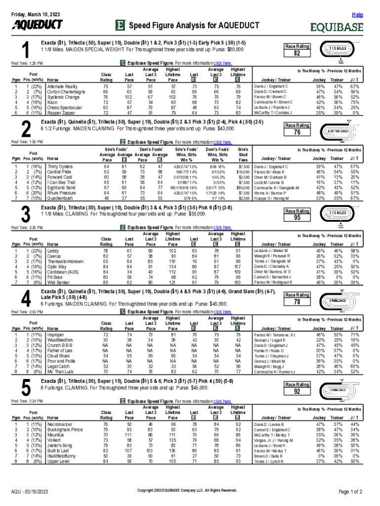 HelpFriday, March 10, 2023Speed Figure Analysis for AQUEDUCT1Exacta ($1), Trifecta (.50), Super (.10), Double ($1) 1 & 2, Pick 3 ($1) (13) Early Pick 5 (.50) (15) 1 1/8 Miles. MAIDEN SPECIAL WEIGHT.
