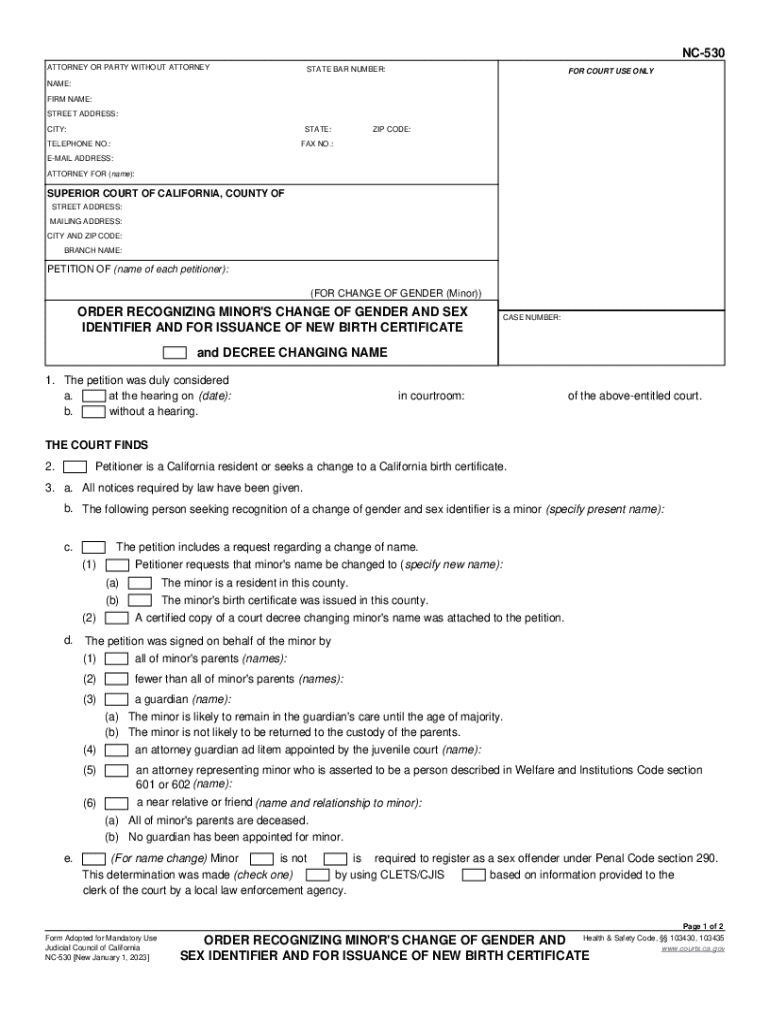 This document serves as a petition and court order recognizing a minor\'s change of gender and sex identifier. It provides the necessary legal framework for the minor to have their name and gender officially changed on their birth certificate in California.