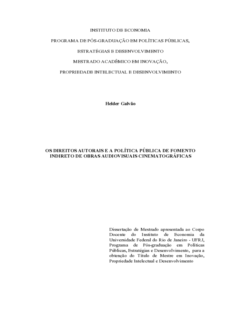 INSTITUTO DE ECONOMIA PROGRAMA DE PSGRADUAO EM POLTICAS PBLICAS, ESTRATGIAS E DESENVOLVIMENTO MESTRADO ACADMICO EM INOVAO, PROPRIEDADE INTELECTUAL E DESENVOLVIMENTOHelder GalvoOS DIREITOS AUTORAIS
