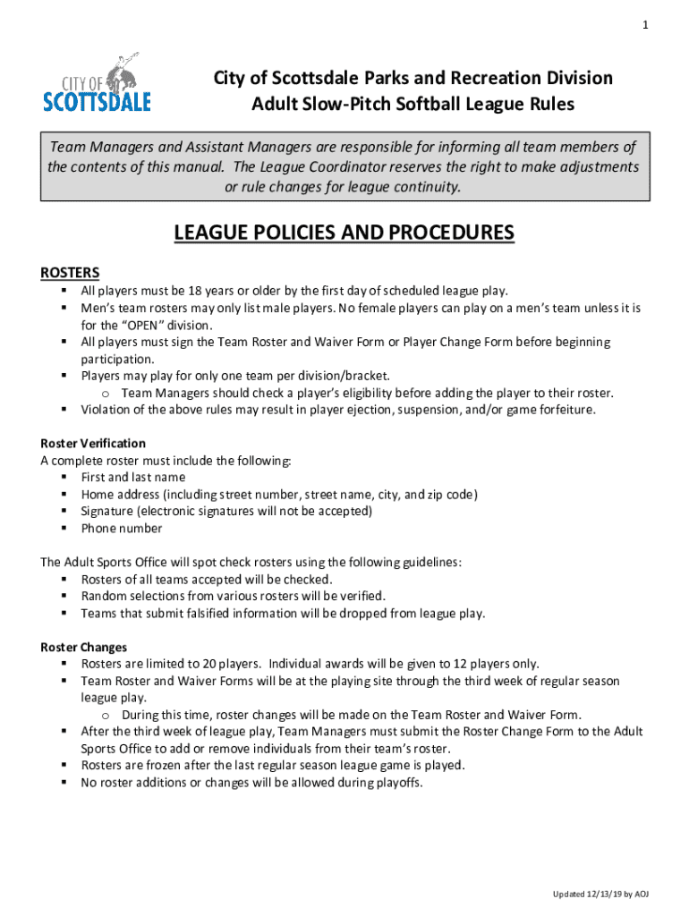 1City of Scottsdale Parks and Recreation Division Adult SlowPitch Softball League Rules Team Managers and Assistant Managers are responsible for informing all team members of the contents of this