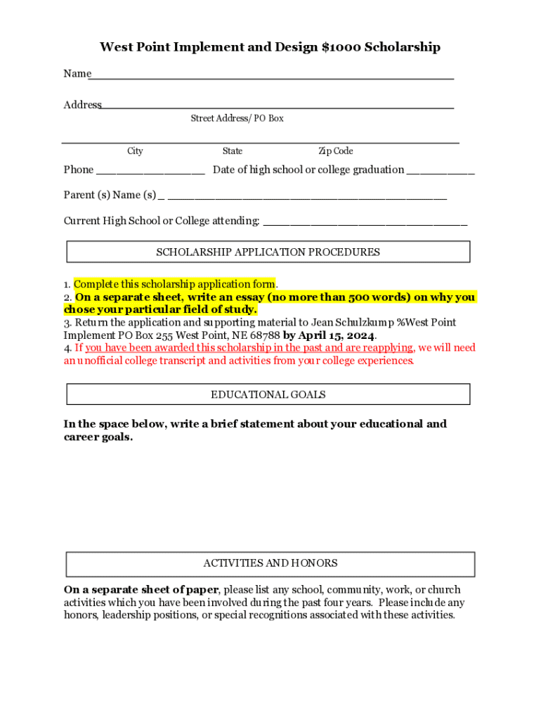 This document is an application form for the West Point Implement and Design $1000 Scholarship, detailing the required information and procedures for scholarship applicants, including essay submission and educational goals.