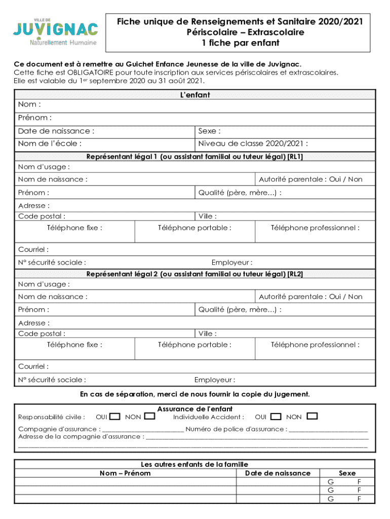Fiche unique de Renseignements et Sanitaire 2020/2021 Priscolaire Extrascolaire 1 fiche par enfant Ce document est remettre au Guichet Enfance Jeunesse de la ville de Juvignac. Cette fiche est OBLIGATOIRE