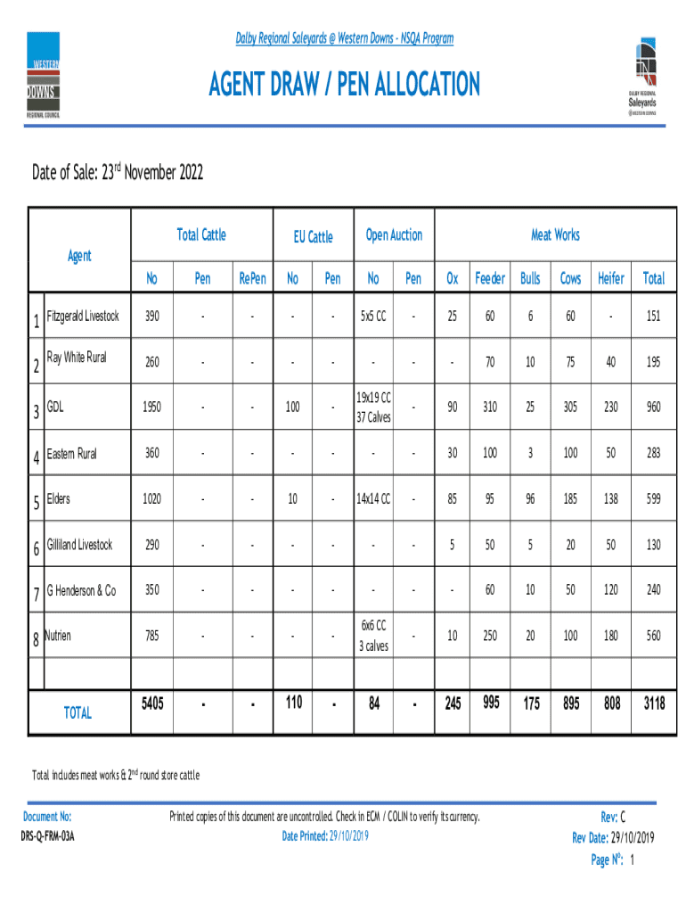 Date of Sale: 23rd November 2022 Total CattleEU CattleAgentOpen AuctionMeat WorksNoPenRePenNoPenNoPenOxFeederBullsCowsHeiferTotal1Fitzgerald Livestock3905x5 CC25606601512Ray White Rural260701075401953GDL195010019x19