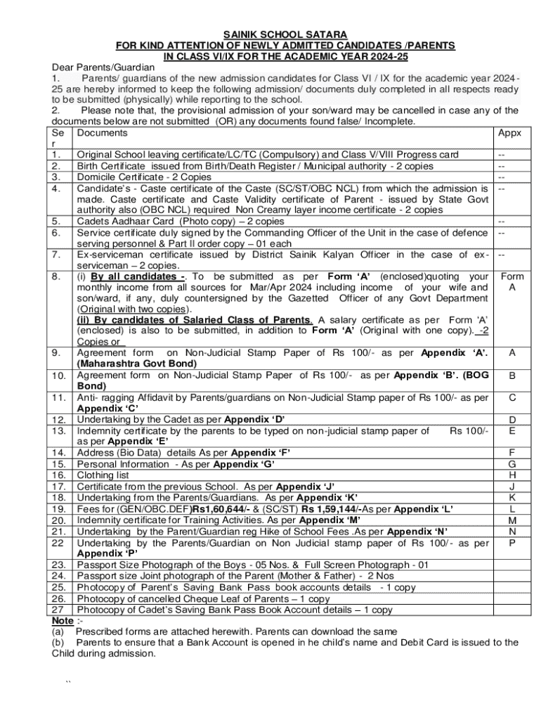 SAINIK SCHOOL SATARA FOR KIND ATTENTION OF NEWLY ADMITTED CANDIDATES /PARENTS IN CLASS VI/IX FOR THE ACADEMIC YEAR 202425 Dear Parents/Guardian 1. Parents/ guardians of the new admission candidates