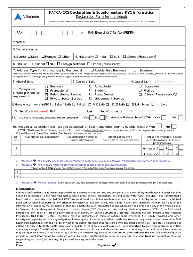 FATCACRS Declaration & Supplementary KYC Information Declaration Form for Individuals Please consult a tax professional for further guidance regarding your tax residency for FATCA & CRS compliance1.