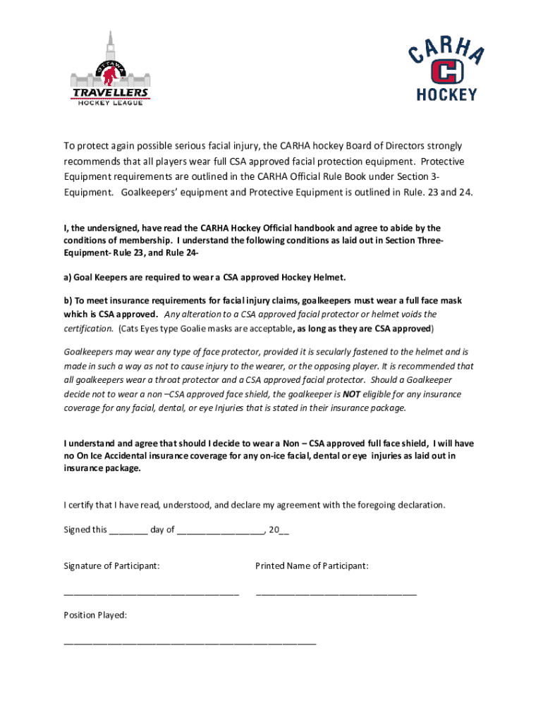 To protect again possible serious facial injury, the CARHA hockey Board of Directors strongly recommends that all players wear full CSA approved facial protection equipment. Protective Equipment requirements