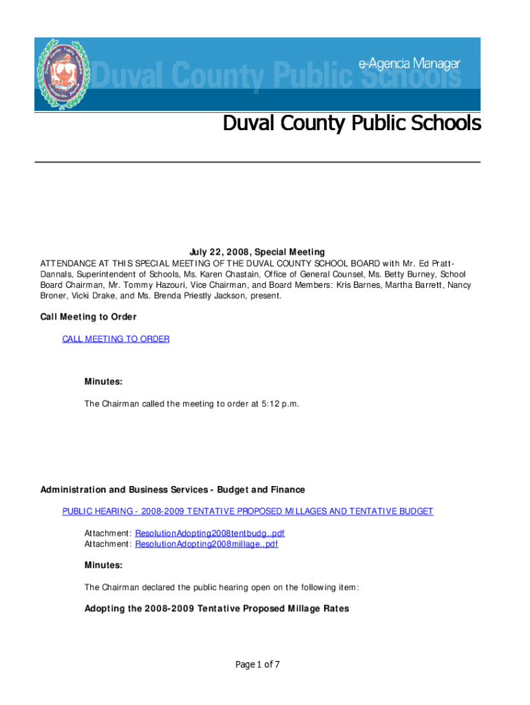 Duval County Public SchoolsJuly 22, 2008, Special Meeting ATTENDANCE AT THIS SPECIAL MEETING OF THE DUVAL COUNTY SCHOOL BOARD with Mr. Ed PrattDannals, Superintendent of Schools, Ms. Karen Chastain,
