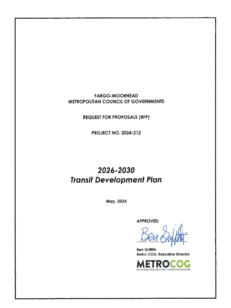 REQUEST FOR PROPOSALS (RFP) The FargoMoorhead Metropolitan Council of Governments (Metro COG) requests proposals from qualified consultants for the following project: 20262030 Transit Development