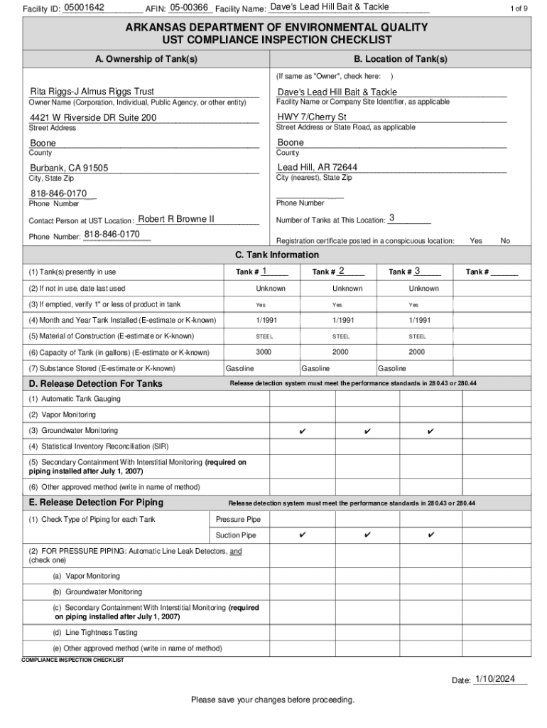 1 of 9Dave\'s Lead Hill Bait & Tackle 0500366 Facility Name: ___ 05001642 Facility ID: ___ AFIN: ___ARKANSAS DEPARTMENT OF ENVIRONMENTAL QUALITY UST COMPLIANCE INSPECTION CHECKLIST A. Ownership of