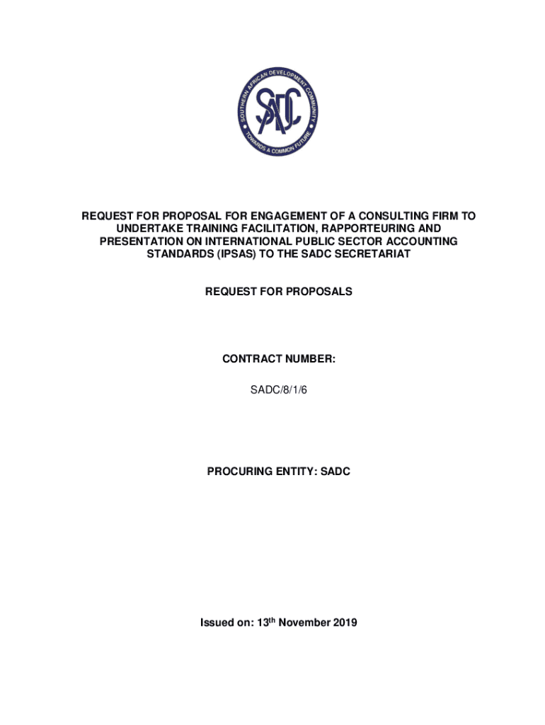 REQUEST FOR PROPOSAL FOR ENGAGEMENT OF A CONSULTING FIRM TO UNDERTAKE TRAINING FACILITATION, RAPPORTEURING AND PRESENTATION ON INTERNATIONAL PUBLIC SECTOR ACCOUNTING STANDARDS (IPSAS) TO THE SADC
