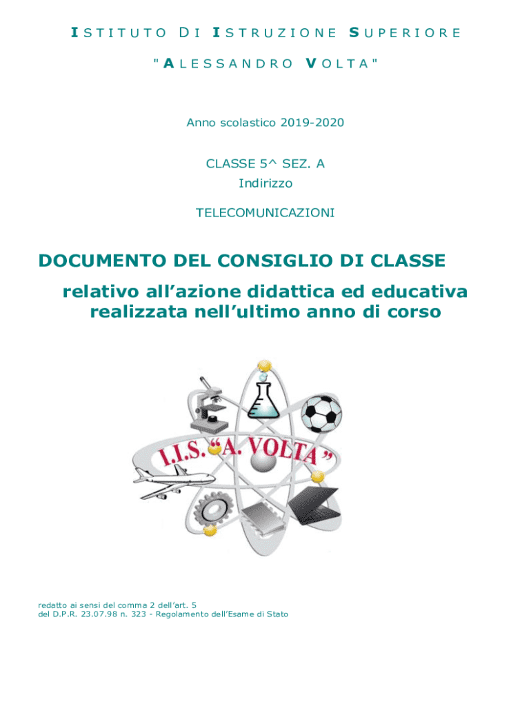 ISTITUTO DI ISTRUZIONE SUPERIORE \"A LESSANDROVOLTA\"Anno scolastico 20192020CLASSE 5^ SEZ. A Indirizzo TELECOMUNICAZIONIDOCUMENTO DEL CONSIGLIO DI CLASSE relativo allazione didattica ed educativa