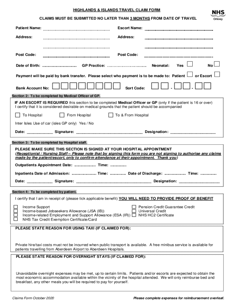 HIGHLANDS & ISLANDS TRAVEL CLAIM FORM CLAIMS MUST BE SUBMITTED NO LATER THAN 3 MONTHS FROM DATE OF TRAVEL Patient Name:Escort Name:Address:Address:Post Code:Post Code:Date of Birth: ................................GP