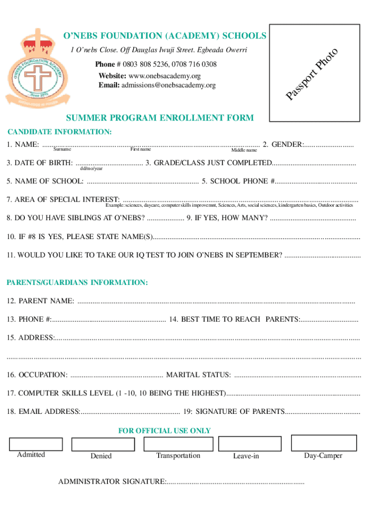 This form is for enrolling candidates in the O\'NEBS Foundation Academy\'s summer program. It collects information about the candidate, their interests, and parental contact details for admission consideration.
