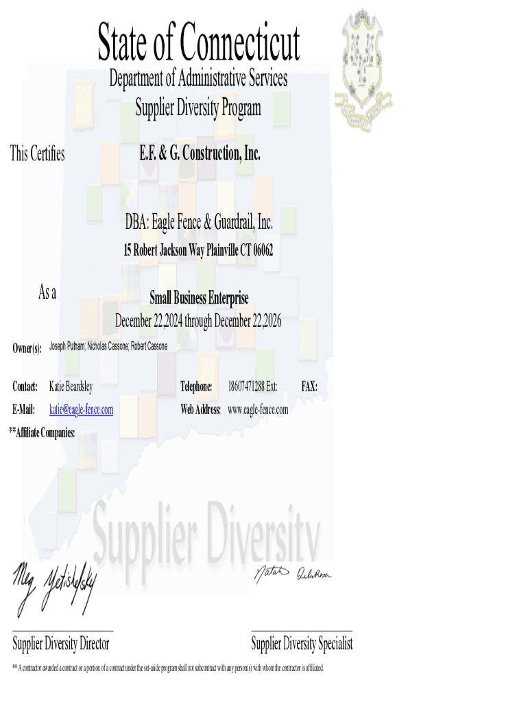 This document certifies E.F. & G. Construction, Inc., operating as Eagle Fence & Guardrail, Inc., as a Small Business Enterprise under the State of Connecticut\'s Supplier Diversity Program for the period of December 22, 2024, through December 22, 2026. It includes contact information for the business and stipulates conditions related to subcontracting under the set-aside program.
