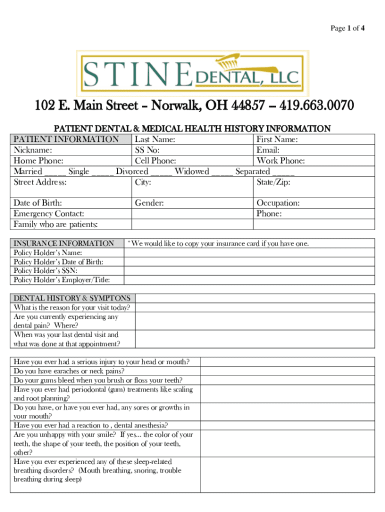Page 1 of 4102 E. Main Street Norwalk, OH 44857 419.663.0070 PATIENT DENTAL & MEDICAL HEALTH HISTORY INFORMATION PATIENT INFORMATION Last Name: First Name: Nickname: SS No: Email: Home Phone: Cell