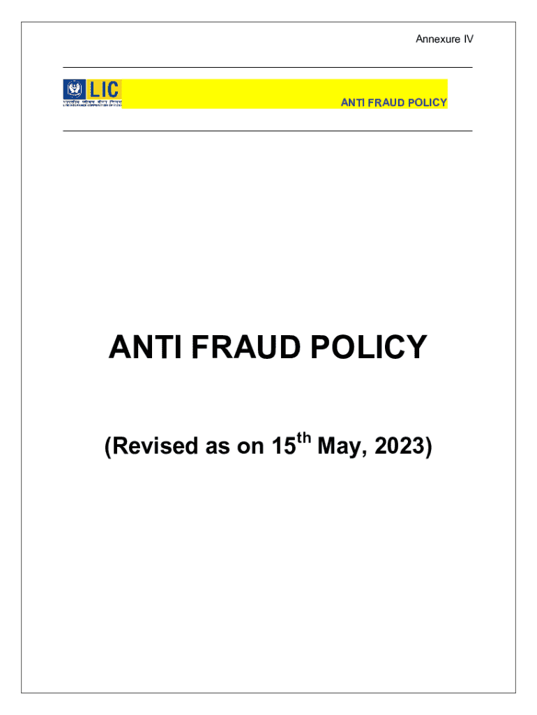 This document outlines the Anti Fraud Policy of the Life Insurance Corporation of India, detailing the objectives, scope, definitions, and classifications of fraud, along with measures for fraud detection, monitoring, and mitigation. The policy emphasizes the importance of integrity and ethical conduct within the organization and sets forth procedures for investigation and reporting of fraud to ensure accountability and protection for both the corporation and its stakeholders.