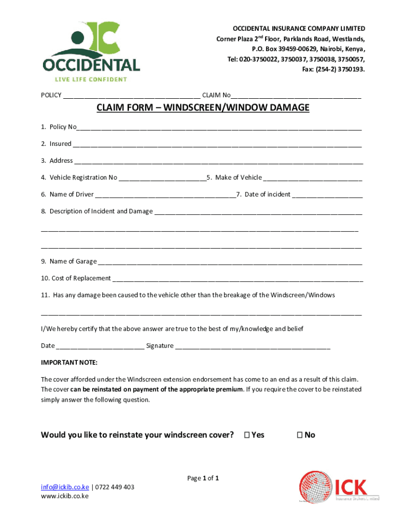 This form is intended for clients of Occidental Insurance Company Limited to report and claim for damage to windscreens or windows of their vehicle. It includes sections to provide policy details, incident description, vehicle information, and the option to reinstate windscreen cover.
