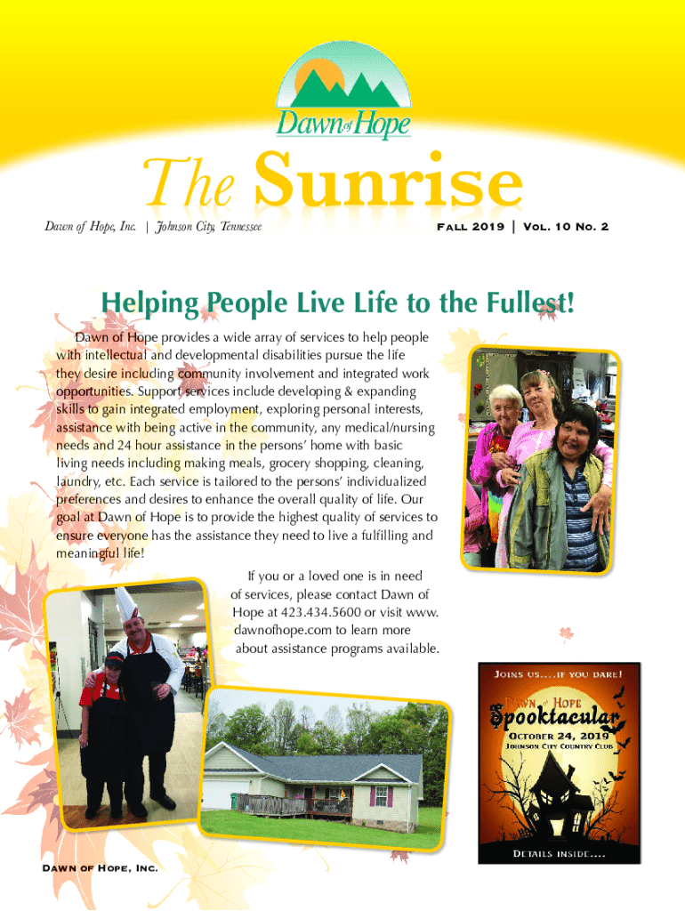 The SunriseDawn of Hope, Inc. | Johnson City, TennesseeFall 2019 | Vol. 10 No. 2Helping People Live Life to the Fullest! Dawn of Hope provides a wide array of services to help people with intellectual