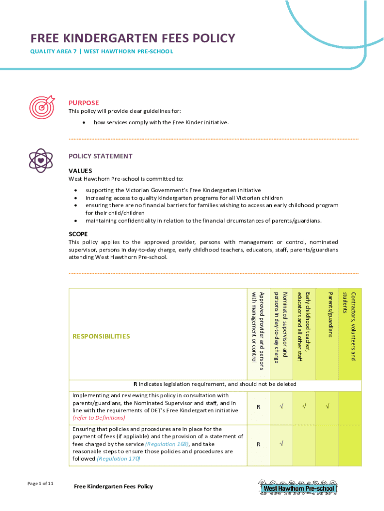 FREE KINDERGARTEN FEES POLICY QUALITY AREA 7 | WEST HAWTHORN PRESCHOOLPURPOSEThis policy will provide clear guidelines for: how services comply with the Free Kinder initiative.POLICY STATEMENT VALUESWest
