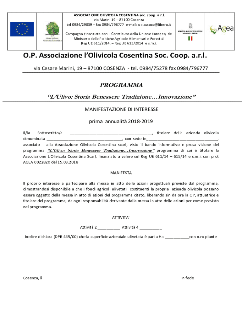 Ottieni il gratuito O.p. Associazione L'olivicola Cosentina S. Coop. S.c A.r.l