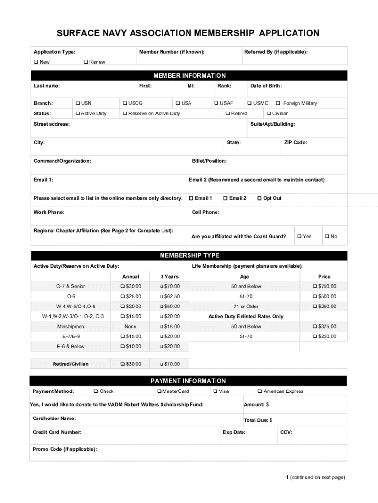 SURFACE NAVY ASSOCIATION MEMBERSHIP APPLICATION Application Type: NewMember Number (if known):Referred By (if applicable): RenewMEMBER INFORMATION Last name:First:MI:Branch: USN USCGStatus: Active